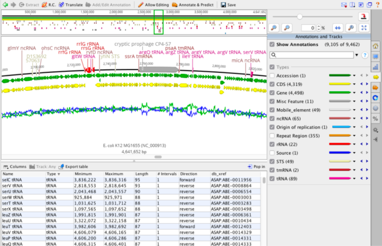 주석이 있는 genome, circular genomes, 매핑된 reads, contigs는 모두 사용자 지정이 가능한 sequence view에 표시됩니다.